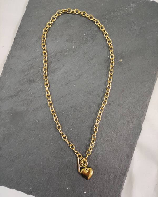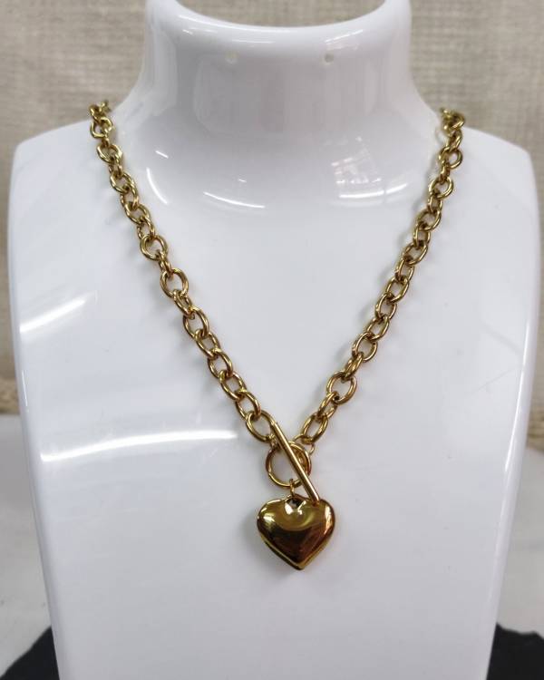 Κολίε πολυμορφικό ατσάλινο αλυσίδα με καρδία σε χρυσό. Η δίασταση του είναι 24,50 εκ και όλο μαζι είναι 26 εκ, η καρδία είναι 1,5 εκ. Θα το παραλάβετε σε συσκευασία δώρου.