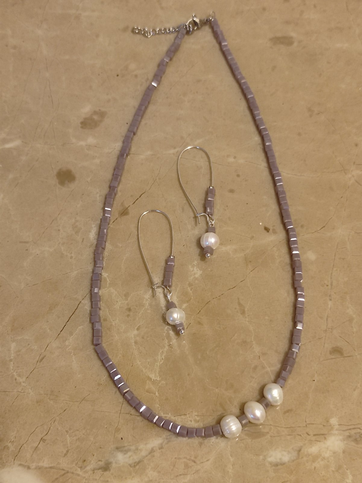 Χειροποίητο σέτ κολίε, με σκουλαρίκια, με κρύσταλλα τετράγωνα μώβ απαλό και τρεία μαργαριτάρια. Το κολίε έχει μάκρος 22 εκ. Τα σκουλαρίκια είναι με μακρόστενο κρίκο, με μάκρος 4 εκ ο κρίκος και όλο μαζι είναι 6 εκ. Θα το παραλάβετε σε συσκευασία δώρου.