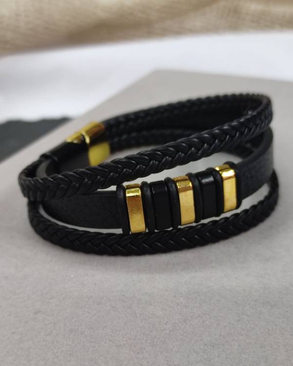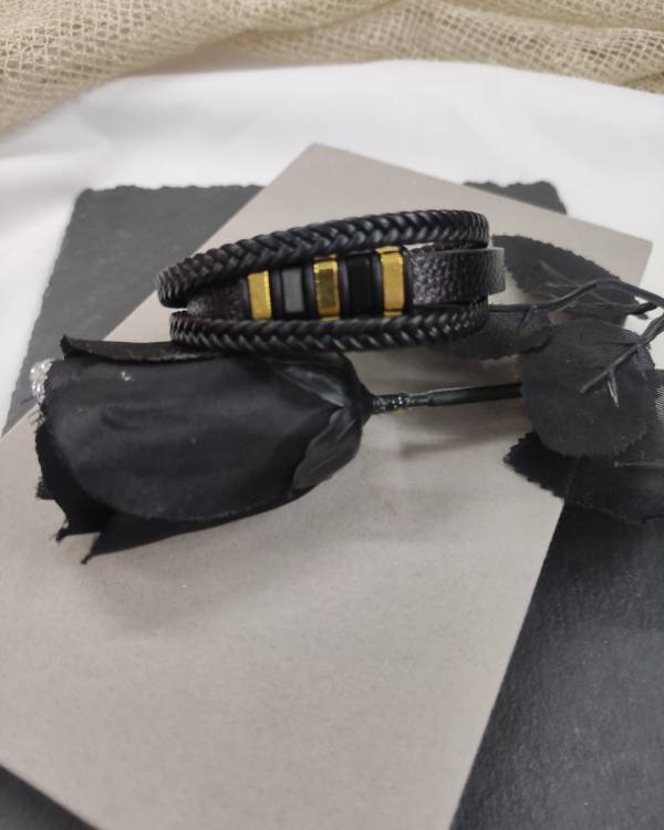 Δερμάτινο ανδρικό βραχίολι μαύρο με στοιχεία χρυσά, μαύρα. Η δίασταση του είναι 22,5 εκ και διαθέτει κούμπωμα με μαγνίτη. Θα το παραλάβετε σε συσκευασία δώρού.