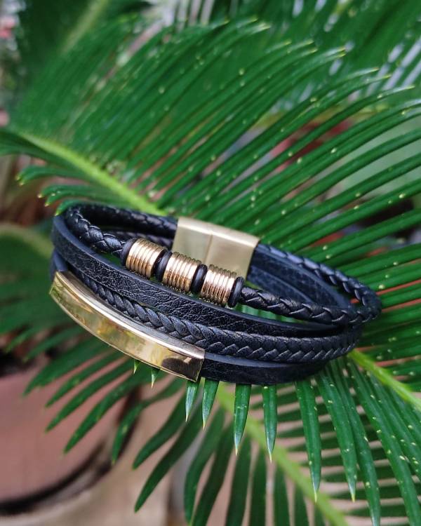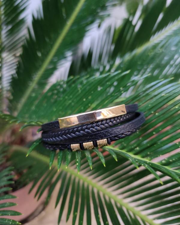 Χειροποιητό δερμάτινο βραχίολι ανδρικό μάυρο, με ανοξείδωτα ατσάλινα στοιχεία σε χρυσό. Έυρος μεγεθών καρπού 15 - 20 εκ. Συνολικό μήκος 22 εκ, με φάρδος 3 εκ. Το ένα στοιχείο είναι 4,5 Χ 1 εκ και το άλλο είναι 2,5 Χ 0,7 εκ. Το κούμπωμα είναι ανοξείδωτο ατσάλι, με 2,5 Χ 1,5 εκ.