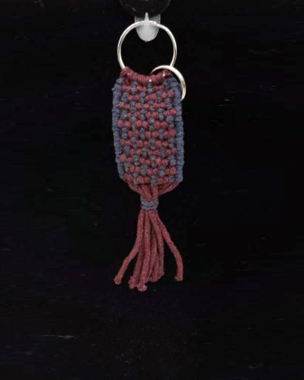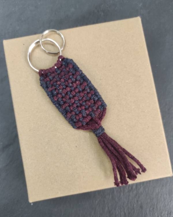 Μπρελόκ μακραμέ πλατύ με δυο χρώματα μπλέ και μπορντώ με κρίκους.Δίασταση 10 εκ μαζί με τα κρόσια ,6 εκ το σχέδιο.