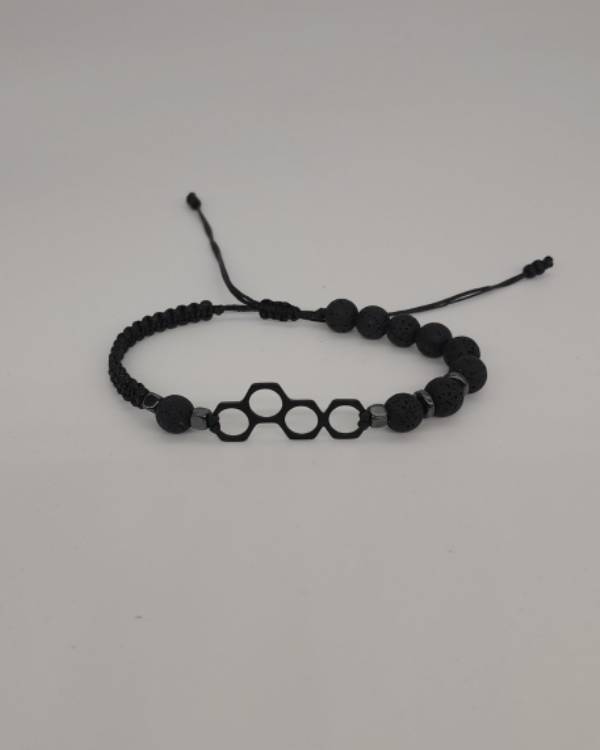 Βραχίολι ανδρικό χειροποίητο με ημιπολύτιμες πέτρες λάβα ,αιματίτες ,στοιχείο ατσάλινο κηρήθρα και κορδόνι φίδι μάυρο. Με κούμπωμα αυξομείωσης. Μάκρος 19 εκ , μαζί με το κούμπωμα είναι 20 εκ.