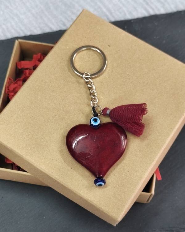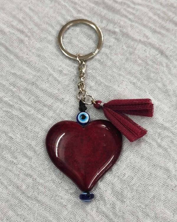 Μπρελόκ με πέτρα ΑΧΑΤΗ σε σχήμα καρδίας, με ματάκια και μια φούντα μπορντό και κρικάκι ασημί με αλυσιδάκι. Η δίασταση του είναι 11 εκ 'ολο μαζί και 4,50 Χ 4 εκ το σχέδιο.