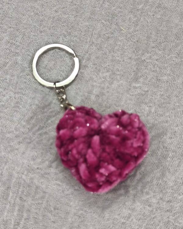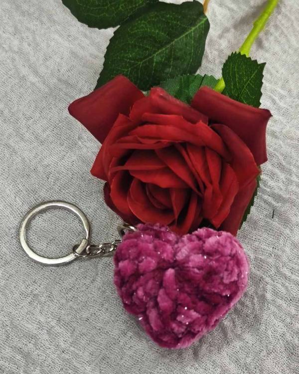 Χειροποιήτο πλεκτό μπρελόκ καρδία, πλεγμένη με νήμα βελούδινο ρόζ και με κρικάκι ασημί με αλυσιδάκι. Η δίασταση του είναι 10 εκ 'ολο μαζί και 5 Χ 5 εκ το σχέδιο.