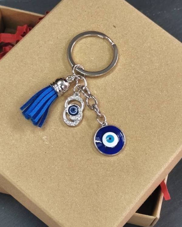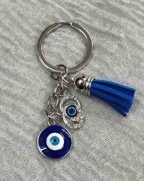 Μπρελόκ μαρτάκι με δυο στοιχεία ασημί με ματακια και φούντα μπλέ και κρικάκι ασημί. Η δίασταση του είναι 8,5 εκ κια τα στοιχεία είναι το ένα 3 εκ και το δέυτερο 2 εκ.