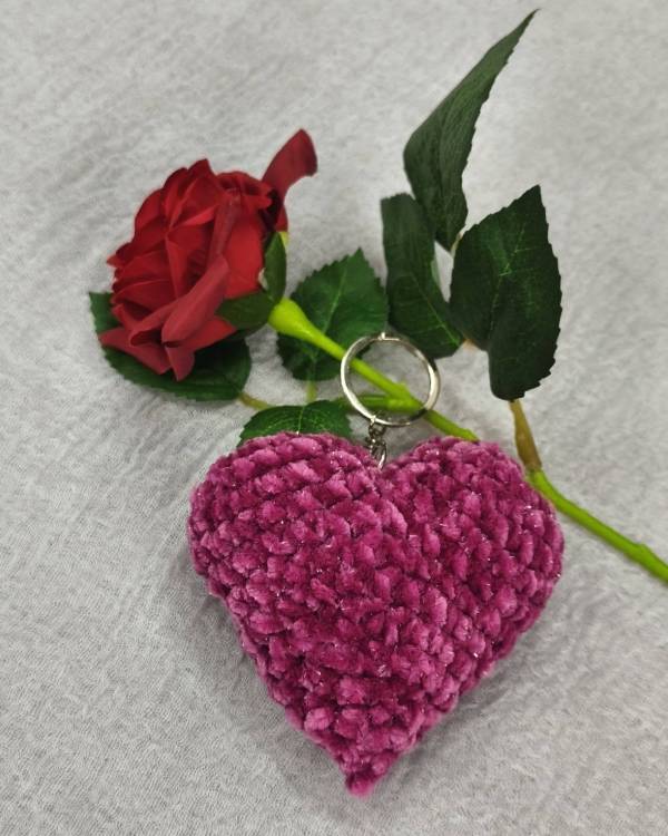 Χειροποιήτο πλεκτό μπρελόκ καρδία, πλεγμένη με νήμα βελούδινο ρόζ και με κρικάκι ασημί με αλυσιδάκι. Η δίασταση του είναι 13 εκ 'ολο μαζί και 10 Χ 10 εκ  το σχέδιο.