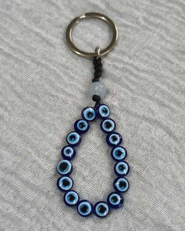 Μπρελόκ θυλάκι με ματάκια και μια γαλάζια χάντρα και κρικάκι ασημί. Η δίασταση του είναι 11 εκ 'ολο μαζί και 6 εκ το σχέδιο.