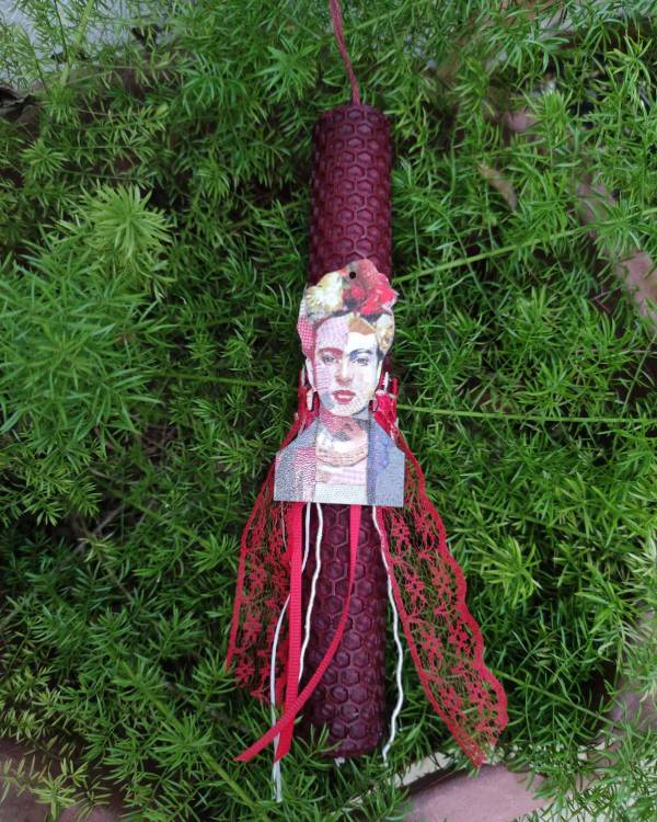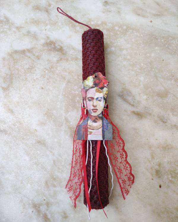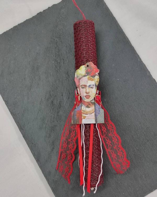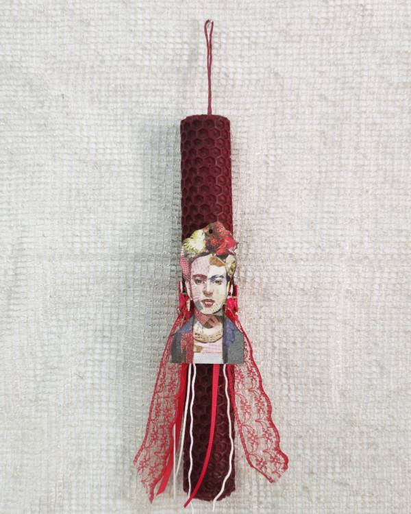 Χειροποιήτη λαμπάδα κυρήθρα μπορντό, με ξύλινο στοιχείο. Η δίασταση της είναι λαμπάδα 22 Χ 3 εκ και το σχέδιο είναι 8 Χ 4 εκ. Θα την παραλάβετε σε συσκευασία δώρου.