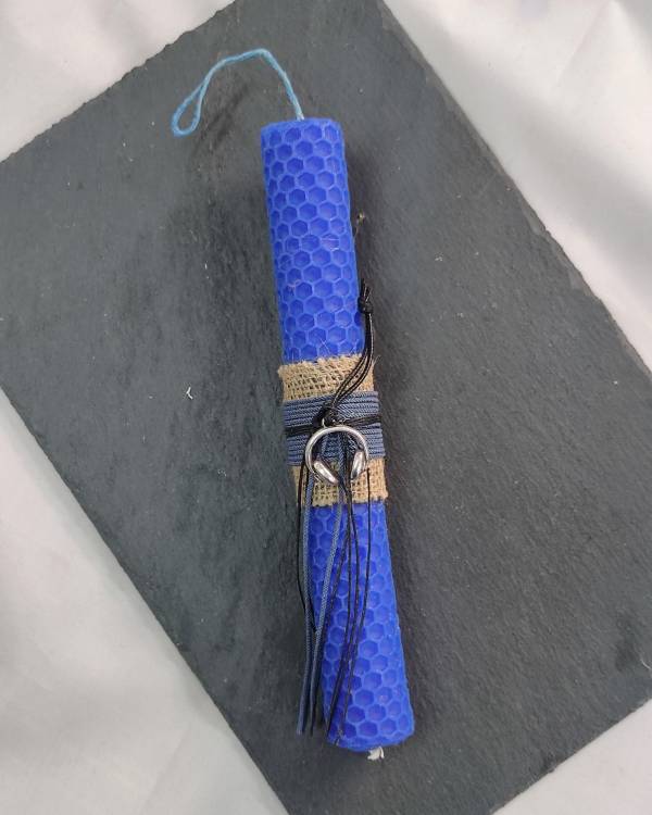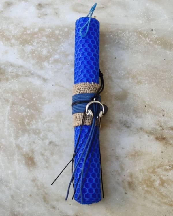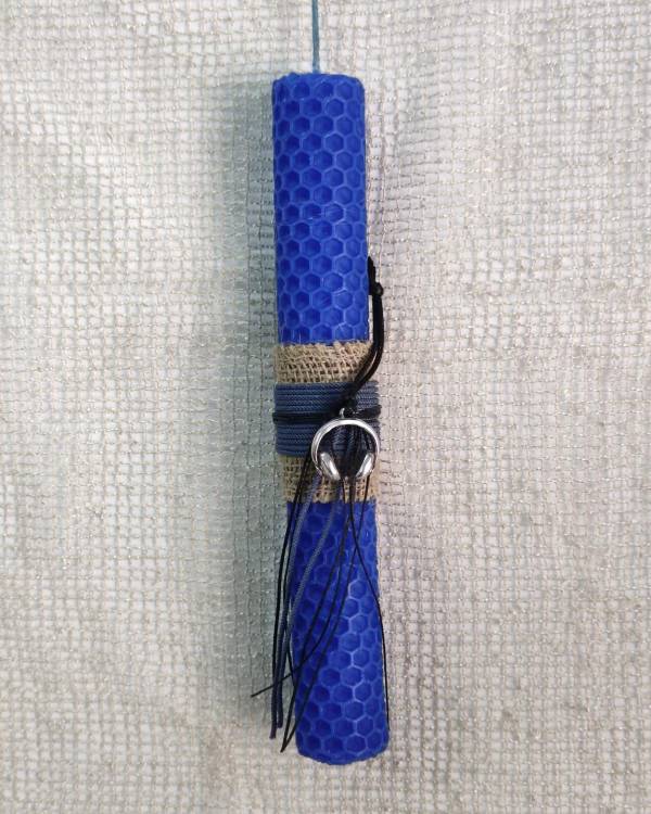 Χειροποιήτη λαμπάδα κηρήθρα μπλέ, με μεταλλικό στοιχείο ακουστικά. Η δίασταση της λαμπάδας 22 Χ 3 εκ και το σχέδιο είναι 3 Χ 2 εκ. Θα την παραλάβετε σε συσκευασία δώρου.