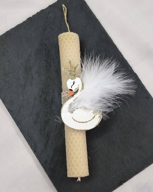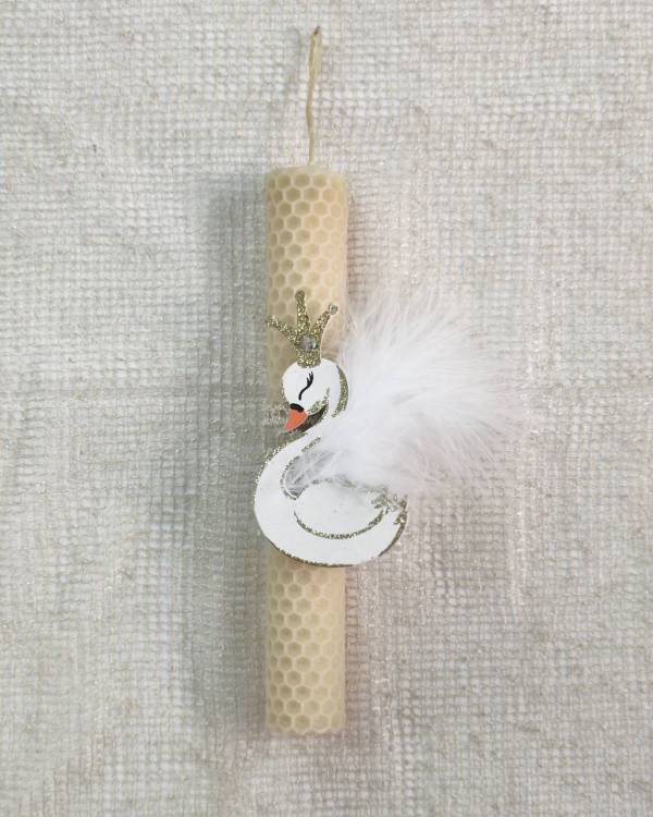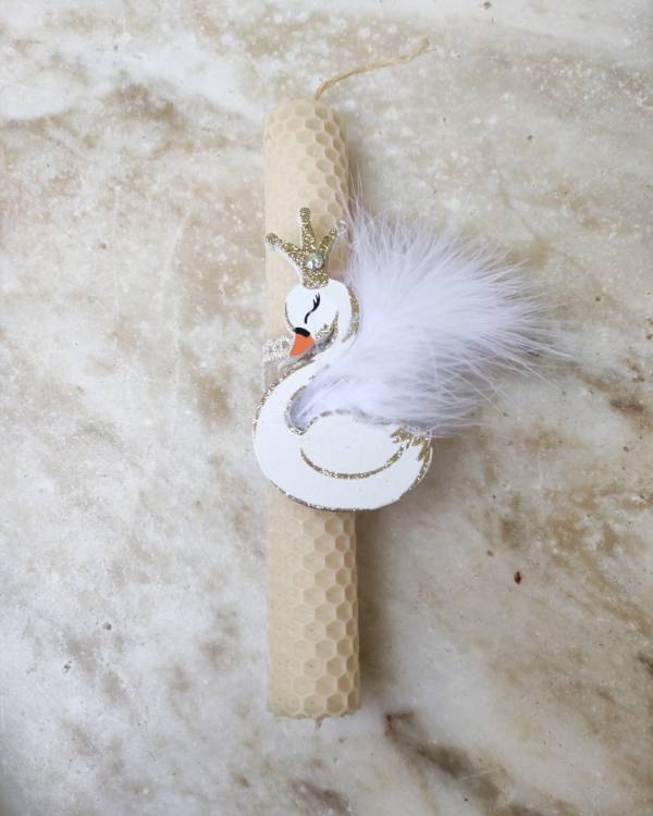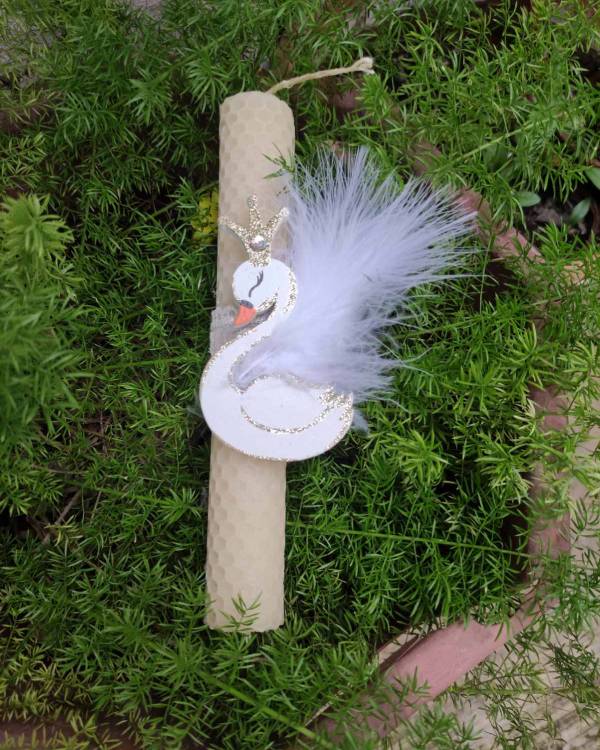 Χειροποιήτη λαμπάδα κηρήθρα εκρού, με ξύλινο στοιχείο κύκνος και φτερά. Η δίασταση της λαμπάδας 22 Χ 3 εκ και το σχέδιο είναι 10 Χ 6 εκ. Θα την παραλάβετε σε συσκευασία δώρου.