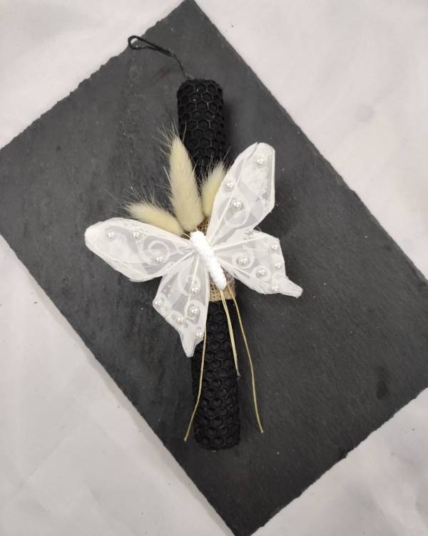 Χειροποιήτη λαμπάδα κηρήθρα μαύρη, με αποξηραμένα και πεταλούδα. Η δίασταση της λαμπάδας 22 Χ 3 εκ και το σχέδιο στοιχείο είναι 14 Χ 11 εκ. Θα την παραλάβετε σε συσκευασία δώρου.