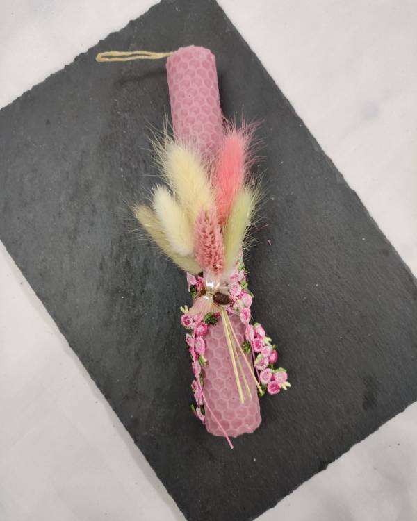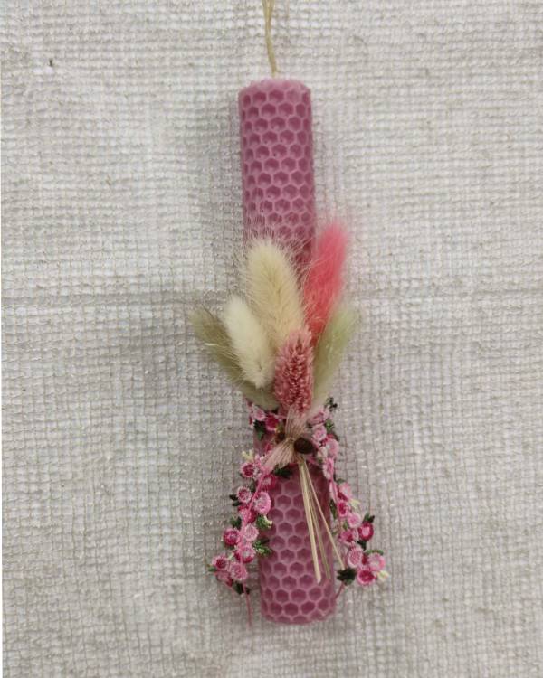 Χειροποιήτη λαμπάδα κηρήθρα σομόν, με αποξηραμένα. Η δίασταση της λαμπάδας 22 Χ 3 εκ και το σχέδιο  είναι 14 Χ 6 εκ. Θα την παραλάβετε σε συσκευασία δώρου.
