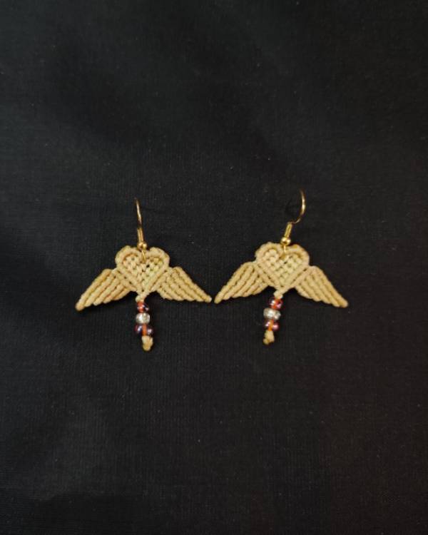 Χειροποιήτο μακραμέ σκουλαρίκι καρδία αγγελάκι, ενα μικρό δωράκι για σας ή για κάποιο αγαπημένο σας πρόσωπο. Πλεγμένο με κηροκλωστή σε σταχί χρώμα και με χάντρες σε χρυσό , μελιτζανί. Το γαντζάκι είναι ατσάλινο. Το ύψος του είναι 3 εκ και το φάρδος του 4 εκ.
