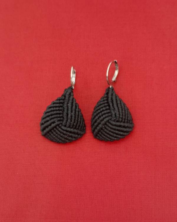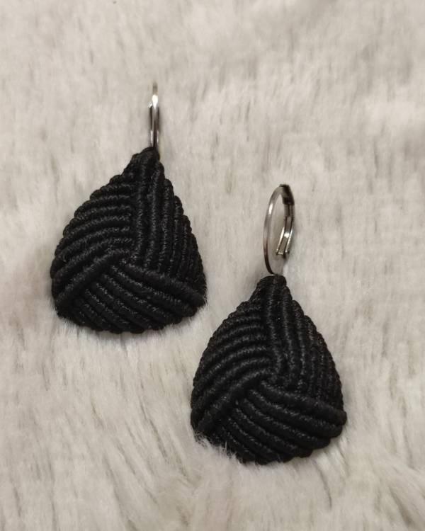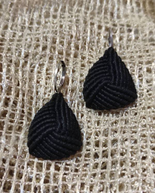 Χειροποιήτα μακραμέ σκουλαρίκια μικρά , σε σχήμα τρίγωνο , πλεγμένο με μάυρη κηροκλωστή , με κρικάκι ατσάλινο ασημί.
