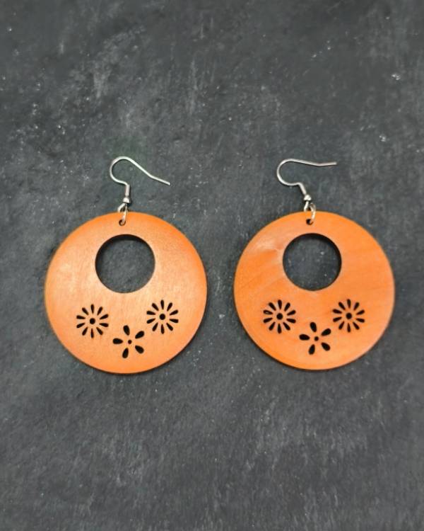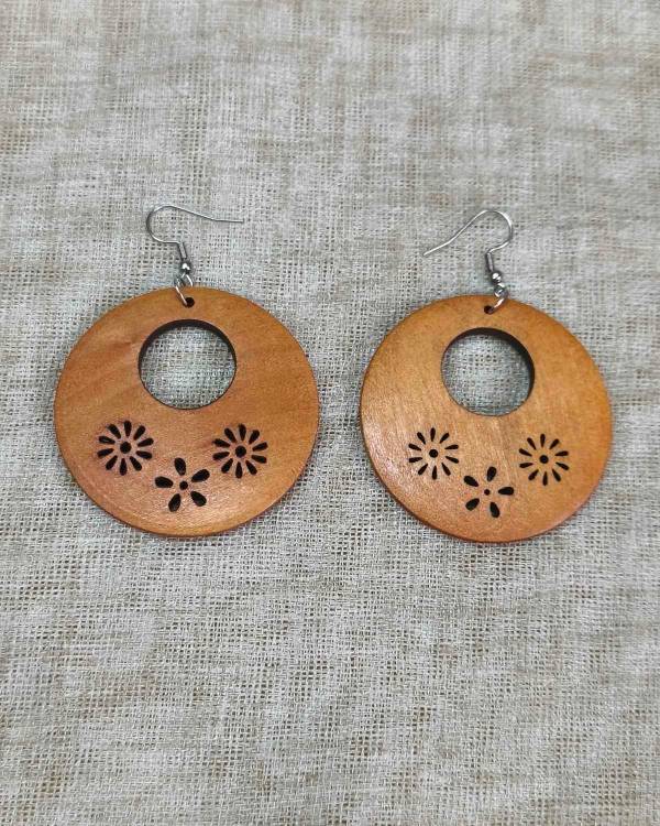 Ξύλινα σκουλαρίκια στρογγυλά σε καφέ ανοιχτό,  με ατσάλινο γαντζάκι. Η δίασταση που έχει τα στοιχείο είναι, 5 Χ 5 εκ και το ύψος είναι 7 εκ.