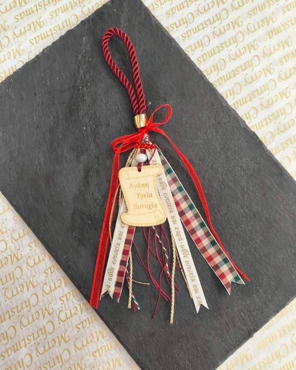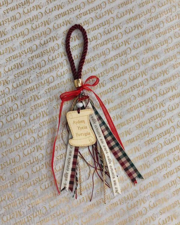 Χειροποίητο χριστουγεννίατικο γούρι με ξύλινο στοιχείο πάπυρος, σχοινι κόκκινο θυλάκι, κορδέλες και ξύλινο 2026. Η δίασταση του είναι 5 Χ 4 εκ το στοιχείο και 24 εκ όλο. Θα το παραλάβετε σε συσκευασία δώρου.
