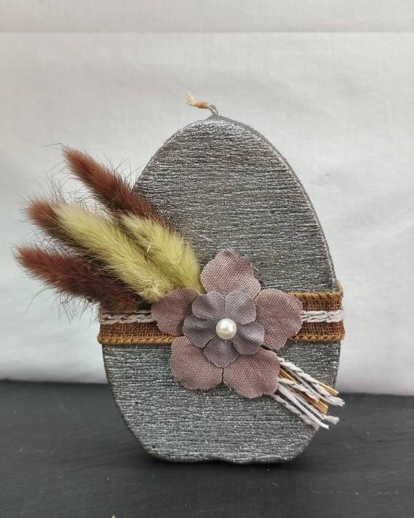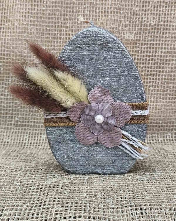 Χειροποιήτο αβγό κερί ασημί, με αποξυραμένα και λουλούδι πάνινο. Η διάσταση του ειναι 9 Χ 13 εκ. Σας έρχεται σε συσκέυασια δώρου.