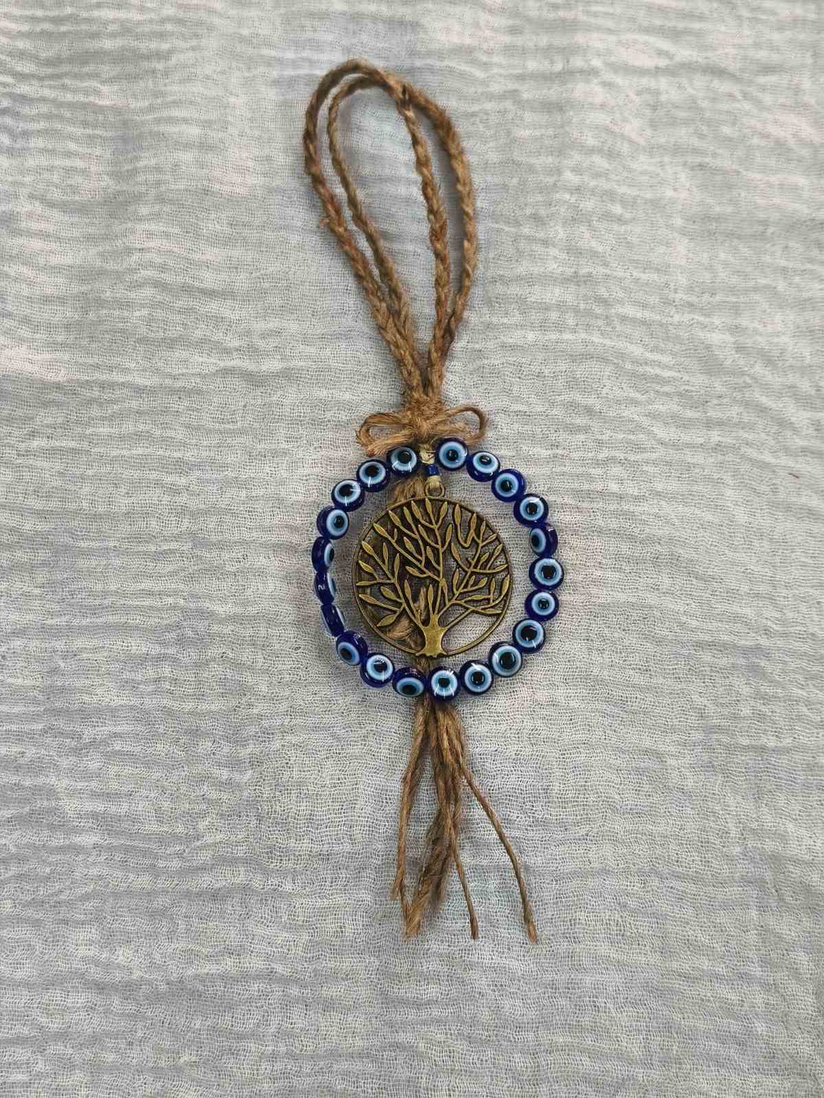 Χειροποιήτο διακοσμητικό μαρτάκι με σχοινί, στεφανάκι με χάντρες ματάκια και μεταλλικό στοιχείο δέντρο ζωής. Το μάκρος του είναι 21 εκ και το στεφανάκι είναι 6 Χ 6 εκ.