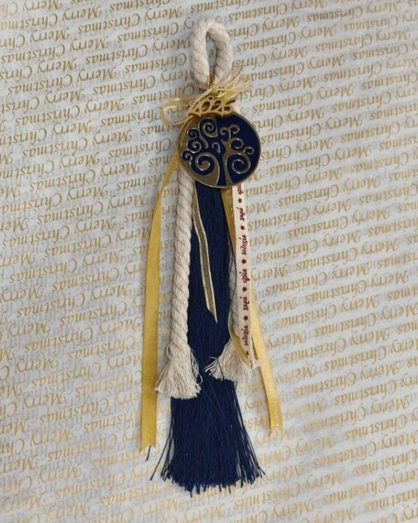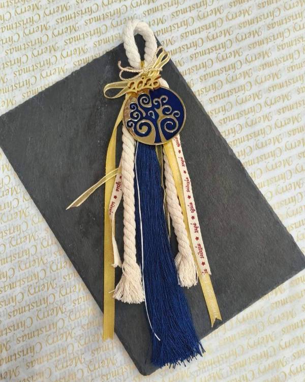 Χειροποίητο γούρι, με μεταλλικό στοιχείο δέντρο ζωής σε πλε χρυσό χρώμα, διακοσμημένο με σχοινι εκρού, κορδελες, φούντα μπλέ και ξύλινο στοιχείο 2026. Η δίασταση του είναι 6 Χ 6 το στοιχείο και το μάκρος που έχει το γούρι είναι 37 εκ. Θα το παραλάβετε σε συσκευασία δώρου.