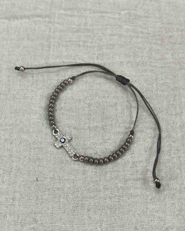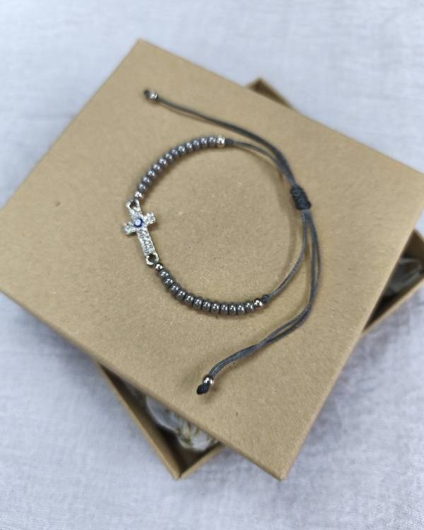 Χειροποίητο βραχίολι μαρτάκι με μεταλλικό στοιχείο σταυρός, με ασημί χάντρες περασμένες σε κηροκλωστή γκρί. Διαθέτει κούμπωμα αυξομείωσης. Η δίασταση του στοιχείου είναι 2,5 Χ 1 εκ όλο το σχέδιο είναι 11 εκ. Θα το παραλάβετε σε συσκευασία δώρου.