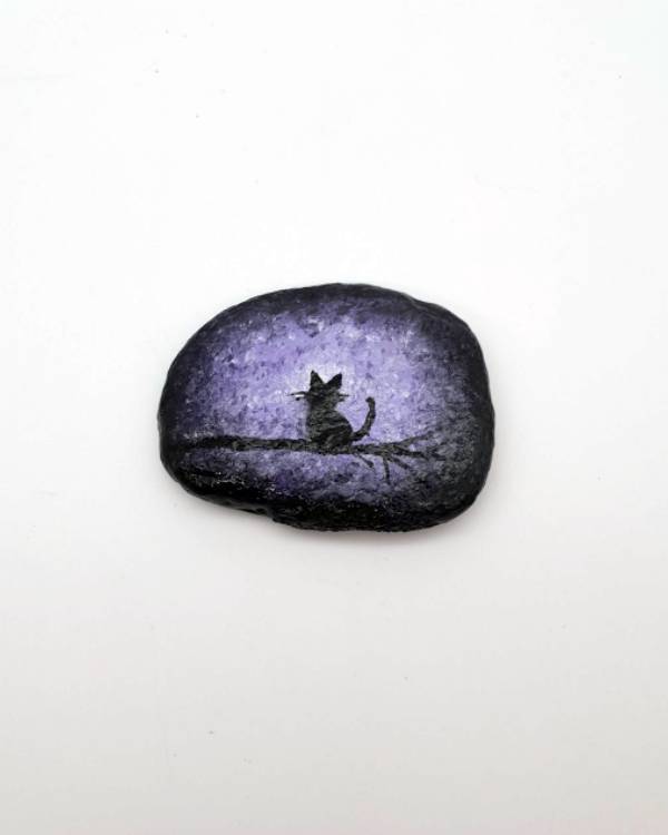 Διακοσμητική πέτρα θαλάσσης , με τοπίο σε μώβ χρώμα και με γάτα. Ζωγραφισμένη στο χέρι με ακρυλικά χρώματα και περασμένη με βερνίκι αδιάβροχο. Οι διαστάσεις έιναι , περίπου , 8 Χ 11.