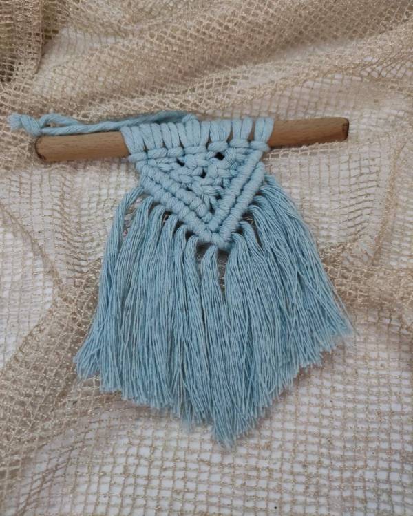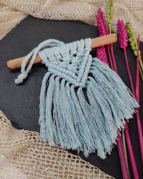 Χειροποιήτο μακραμέ διακοσμητικό τοίχου μικρό σε χρώμα τυρκουάζ . Με ύψος 14 εκ , φάρδος 12 η φουντα , 5 εκ το σχέδιο , ξύλο 15 εκ.