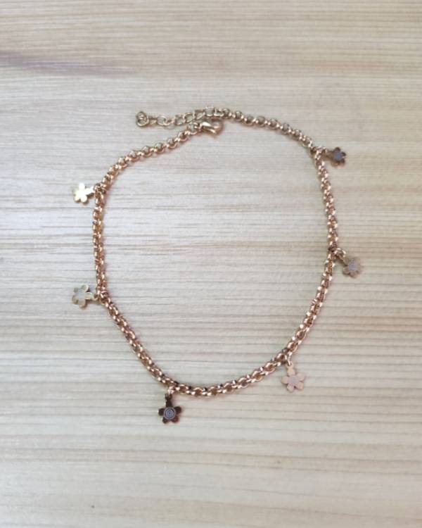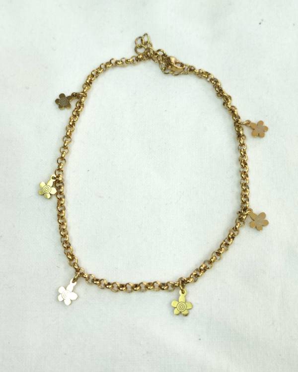 Χειροποίητο ατσάλινο Βραχίολι σε χρυσό, για το πόδι , με κρεμαστά ατσάλινα στοιχεία λουλουδάκια. Η δίασταση του είναι 23 εκ μαζί με το κούμπωμα, διαθέτει αλυσιδάκι αυξομείωσης. Θα το παραλάβετε σε συσκευασία δώρου.