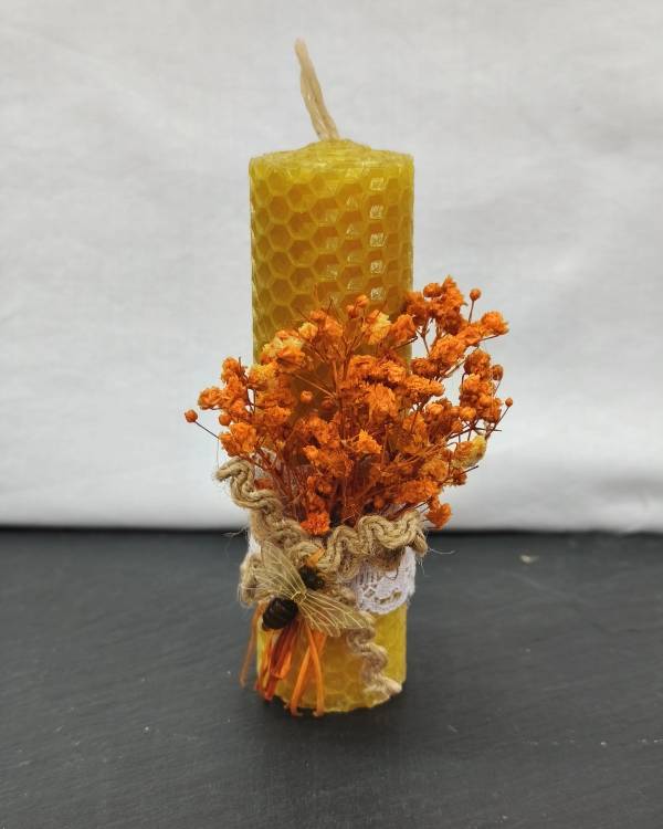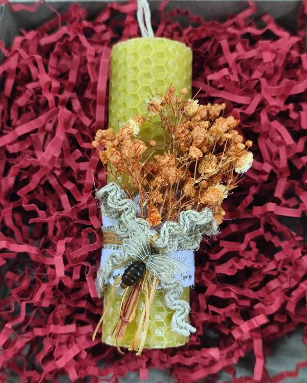 Χειροποιήτο κερί κυρήθρα σε φυσικό χρώμα, με αποξυραμένα. Με διάσταση 11 εκ. Σας έρχεται σε συσκευασία δώρου.