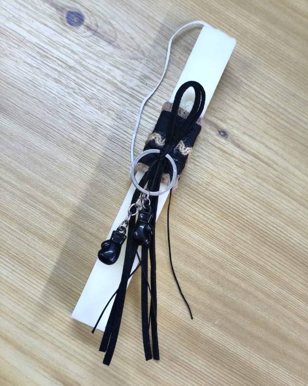 Χειροποίητη λαμπάδα λευκή, με στοιχείο μπρελόκ με γάντια του μπόξ. Η διάσταση της είναι 22 εκ. Θα την παραλάβετε σε συσκευασία δώρου.