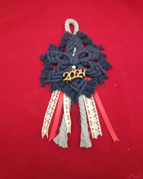 Χειροποίητο γούρι μακραμέ , χιονονιφάδα, πλεγμένο με νήμα μπλέ , με σχοινί γκρί, κορδέλες και ξύλινο στοιχείο 2024. Το σχέδιο είναι 16 εκ και το ύψος του είναι 30 εκ.