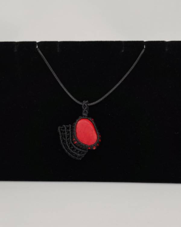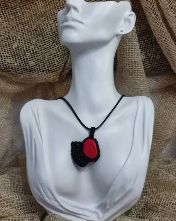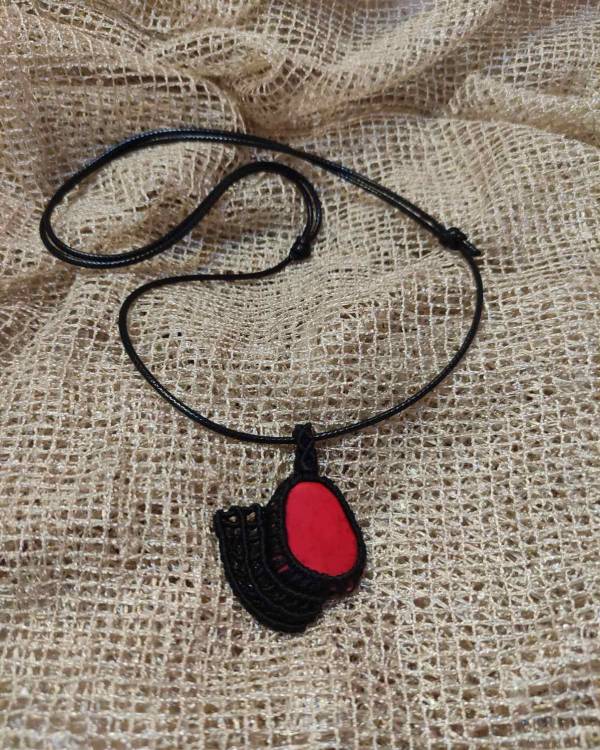 Κολίε μακραμέ χειροποίητο με πέτρα κόκκινη με μάυρη κηροκλωστή , κρεμαστό σε κορδόνι φίδι. Η δίασταση που έχει το σχέδιο είναι 5 Χ 4 εκ. Κούμπωμα αυξομείωσης.