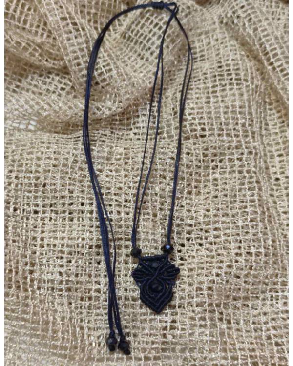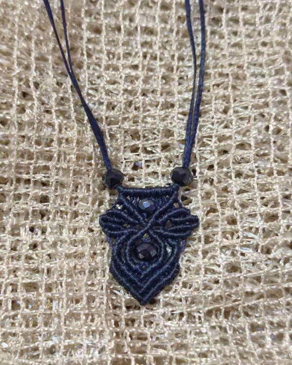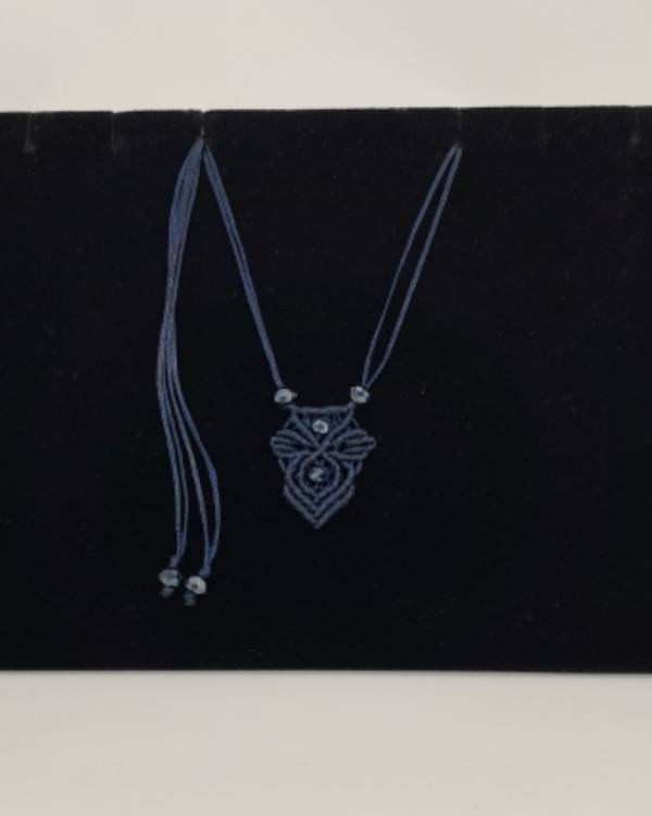 Κολιέ μακραμέ κρεμαστό χειροποίητο με κηροκλωστή σε μπλέ με χάντρες κρύσταλλο. Με κούμπωμα αυξομείωσης.
