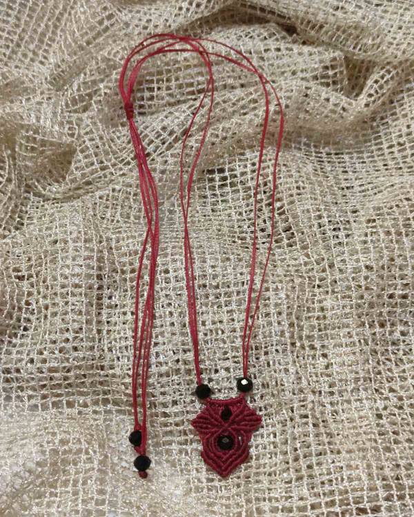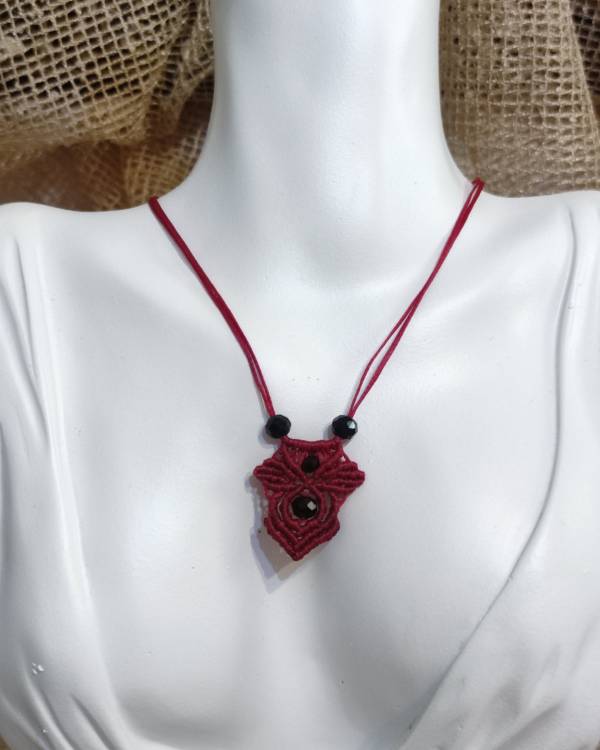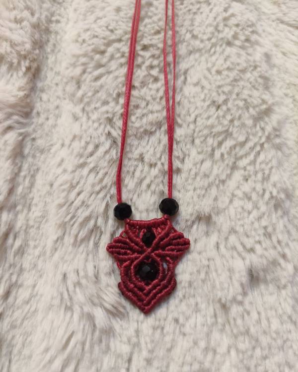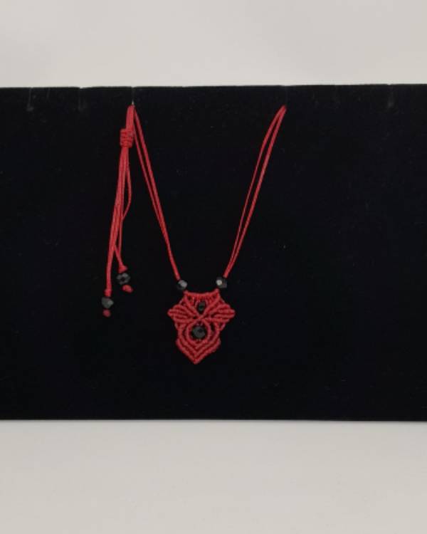 Κολιέ μακραμέ κρεμαστό χειροποίητο με κηροκλωστή σε κόκκινο με χάντρες κρύαταλλο. Η δίασταση του είναι 3 Χ 2 εκ. Με κούμπωμα αυξομείωση.