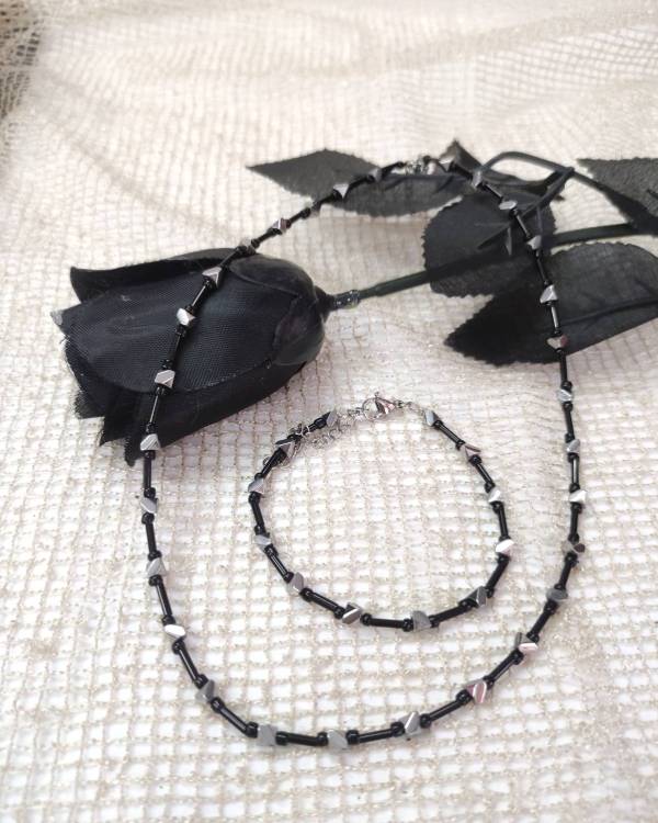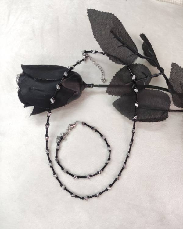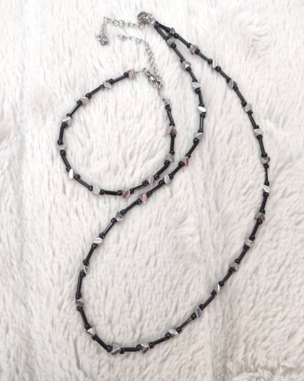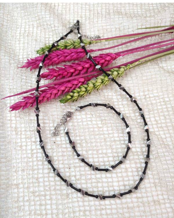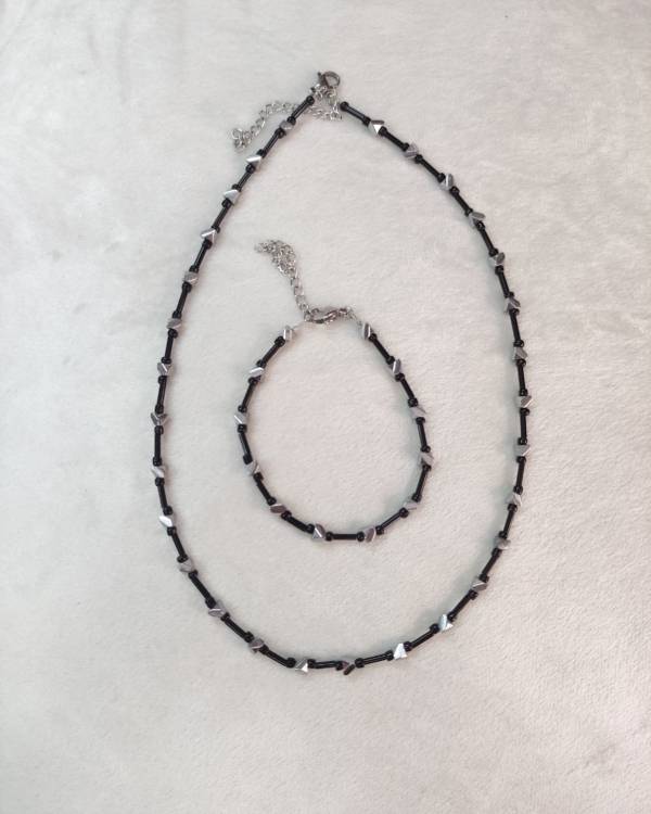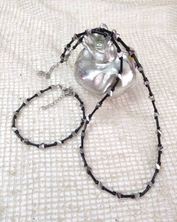 Χειροποιήτο σέτ κολίε με βραχίολι με μάυρες χάντρες και ασημί. Μπορεί να φορεθεί ολη την μέρα. Διαθέτουν και τα δυο αλυσιδάκι για αυξομείωση. Με μακρος το βραχίολι 17 εκ και το 47 εκ το κολίε.