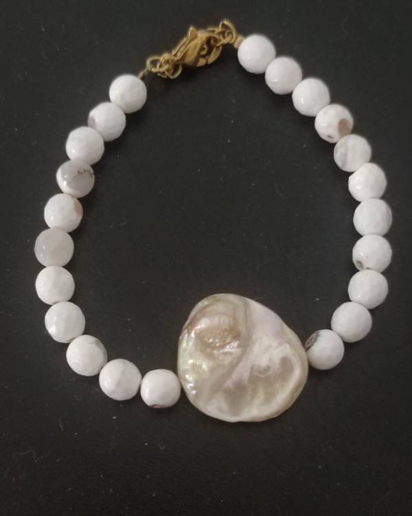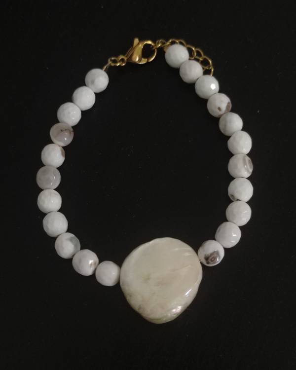 Χειροποιήτο βραχιόλι με πέτρες δόντι και αχάτη. Είναι περασμένες σε ατσαλόσυρμα και διαθέτει αλυσιδάκι αυξομείωσης. Η δίασταση του είναι 17 εκ μαζί με το κούμπωμα.