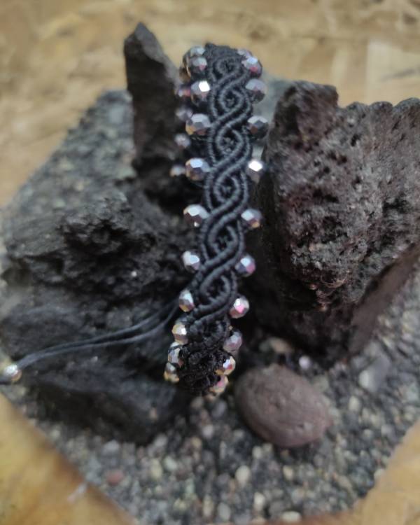 Χειροποίητο βραχίολι μακραμέ , πλεγμένο με κηροκλωστή μάυρη και με πέτρες κρύσταλλα. Διαθέτει κούμπωμα αυξομείωσης. Με μάκρος 18 εκ μαζί με το κούμπωμα αυξομείωσης και φάρδος 1 εκ.