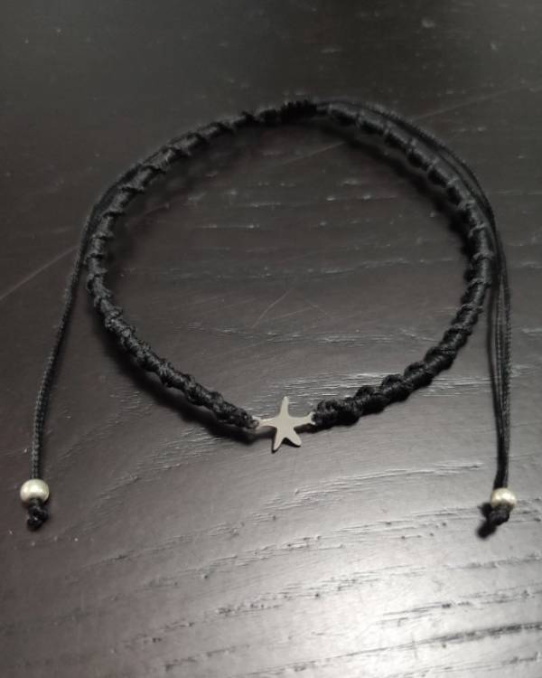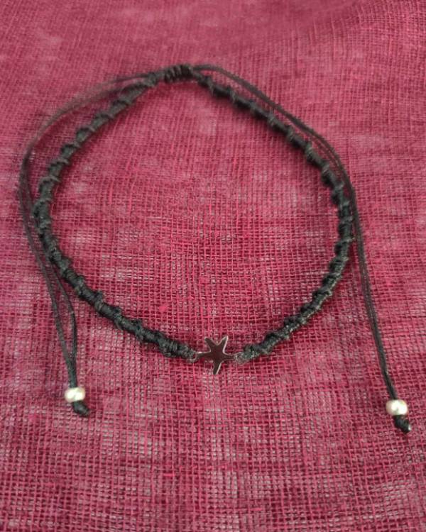 Χειροποιήτο μακραμέ βραχίολι για το πόδι, πλεγμένο με κηροκλωστή σε μαύρο χρώμα και με ατσάλινο στοιχείο αστερίας. Με δίασταση 23 εκ μαζί με το κούμπωμα αυξομείωσης. Θα το παραλάβετε σε συσκευασία δώρου.