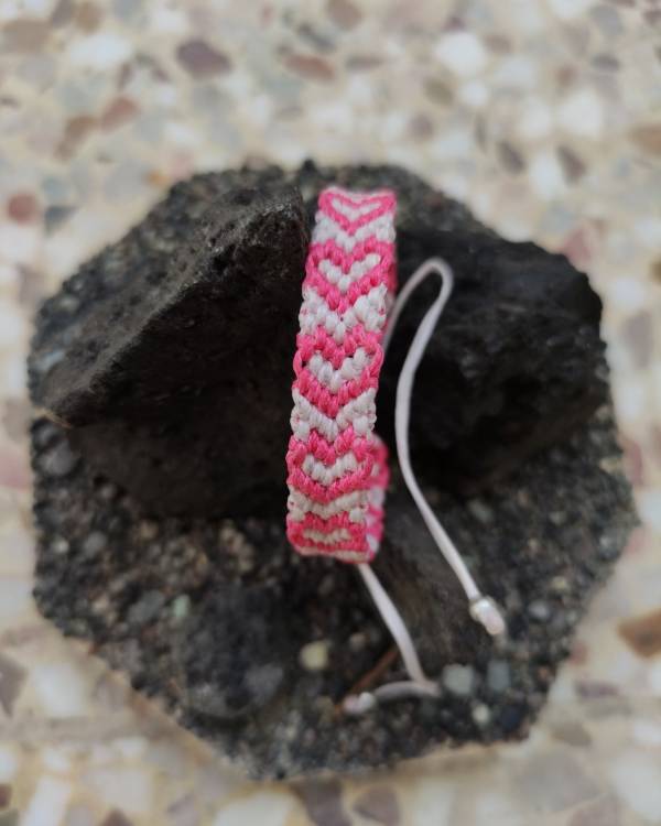 Χειροποιήτο βραχίολι μακραμέ με καρδούλες, για να το χαρίσετε στον εαυτό σας ή σε ένα αγαπημένο σας πρόσωπο. Πλεγμένο με κηροκλωστή ρόζ ανοιχτό και ρόζ σκούρο. Με κούμπωμα αυξομείωσης. Το μάκρος του είναι 16,5 εκ μαζί με το κούμπωμα και φάρδος 1 εκ.