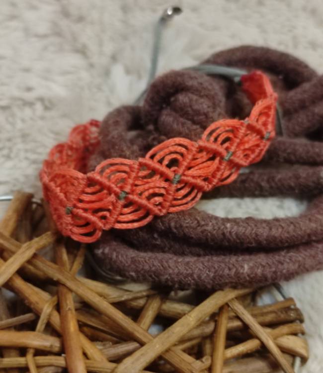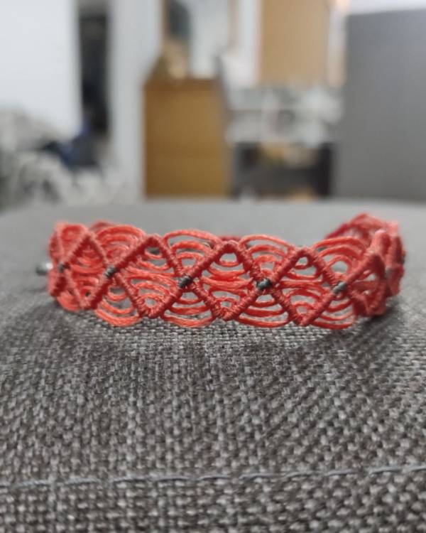 Χειροποίητο μακραμέ βραχίολι λεπτό , πλεγμένο με κηροκλωστή πορτοκαλί σκούρο και λεπτομέρειες γκρί. Με μάκρος 16 εκ μαζί με το κούμπωμα αυξομείωσης και φάρδος 1,5 εκ.