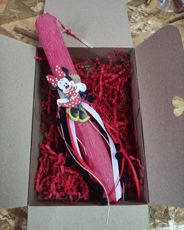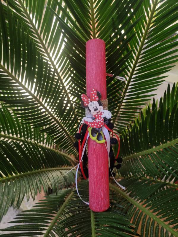Χειροποιήτη λαμπάδα κόκκινη ξυστή , με στοιχείο ξύλινο Μίνη και με κορδέλες. Το ύψος της λαμπάδας είναι 25 εκ. Σας έρχεται σε συσκέυασια λαμπάδας.