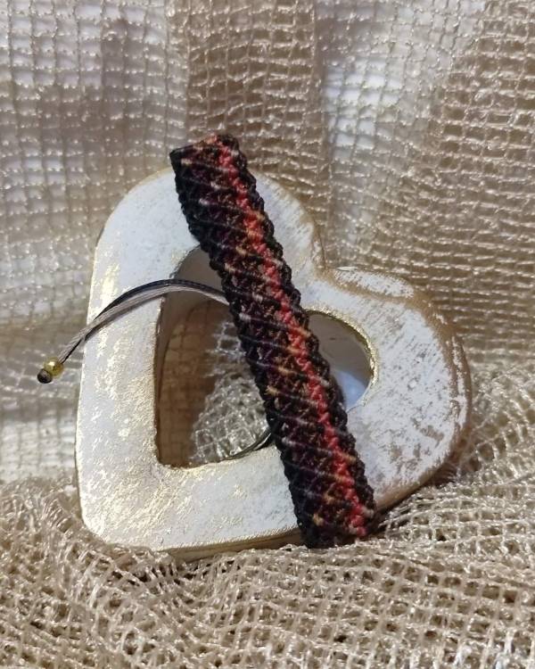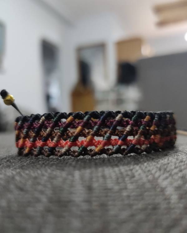 Χειροποίητο μακραμέ πολύχρωμο πλεγμένο κηροκλωστή καφέ, εκρού, πορτοκαλί, πράσινο, μπορντό και μπλέ. Με μάκρος 16 εκ με το κούμπωμα αυξομείωσης και φάρδος 1 εκ.