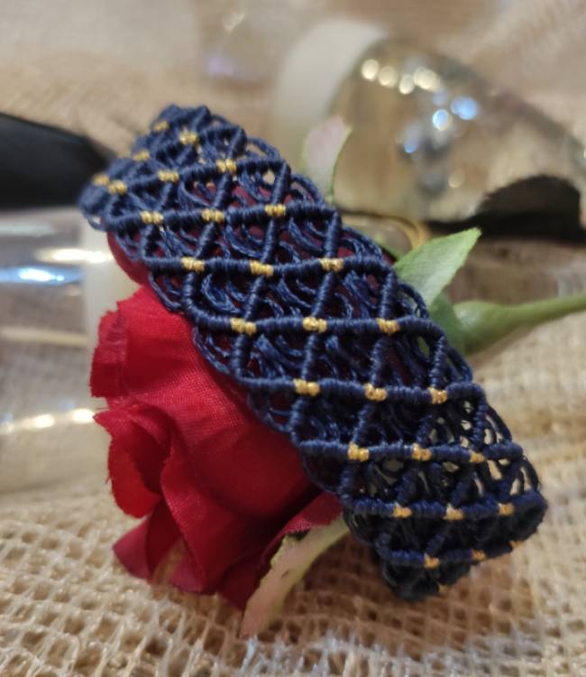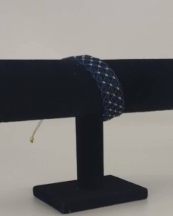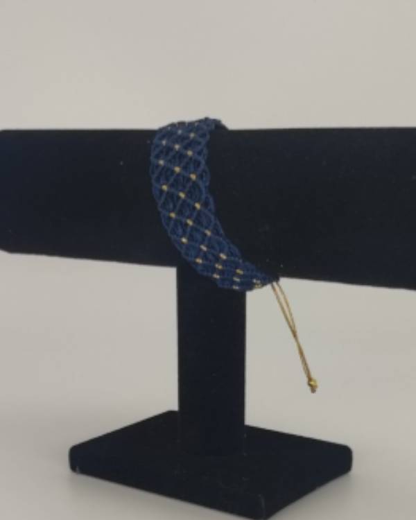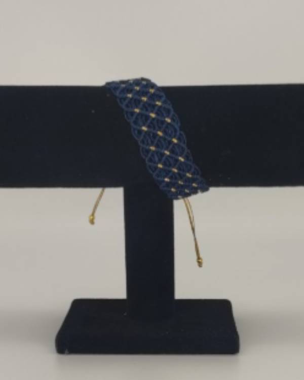 Βραχίολι μακραμέ χειροποίητο πλεγμένο με μπλέ και χρυσή κηροκλωστή. Διαθέτη κούμπωμα αυξομείωσης. Μάκρος 15,5 εκ και φάρδος 2,5 εκ.