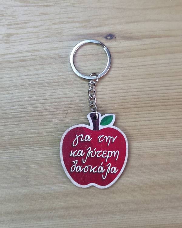 Μπρελόκ ξύλινο σε σχήμα μήλο, για την δασκάλα. Με κρίκο, με αλυσιδάκι, σε ασημί. Η διάσταση του είναι 4,50 Χ 5 εκ και το ύψος του μαζί με το κρικάκι είναι 10 εκ. Θα το παραλάβετε σε συσκευασία δώρου.