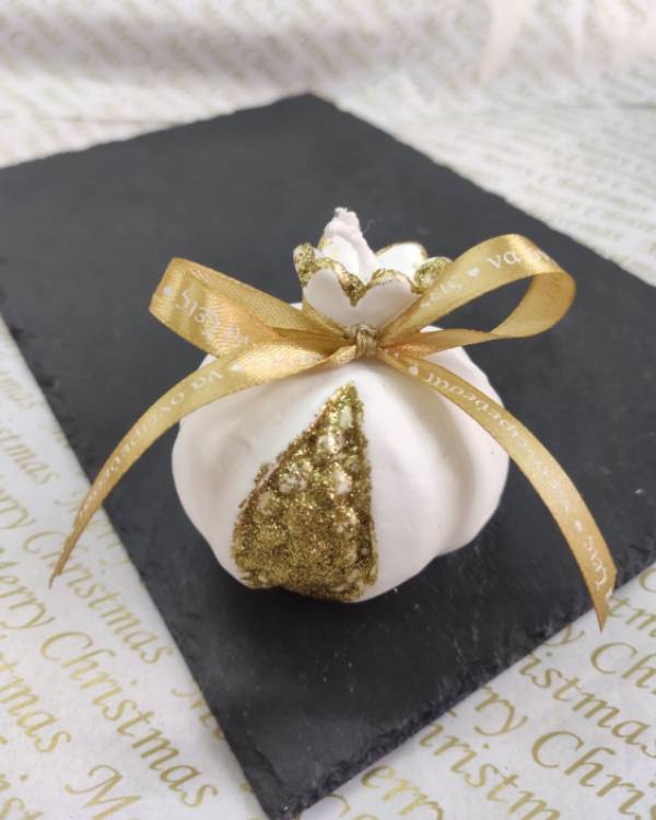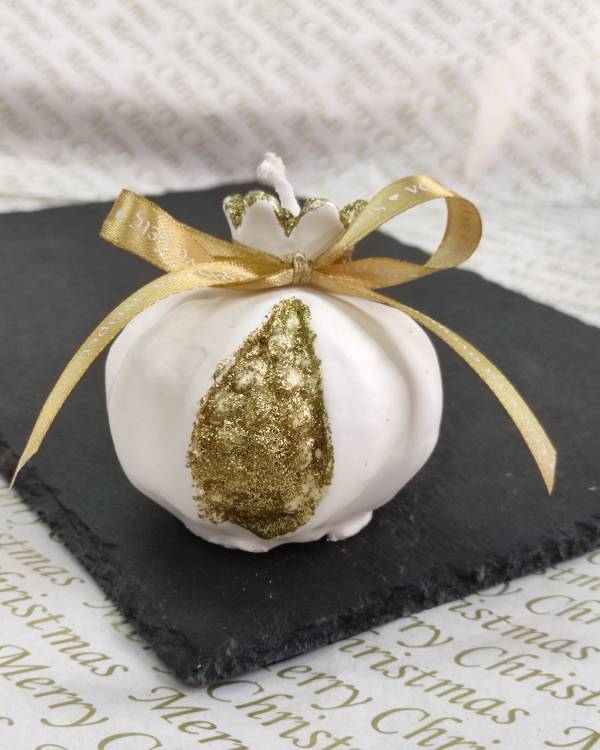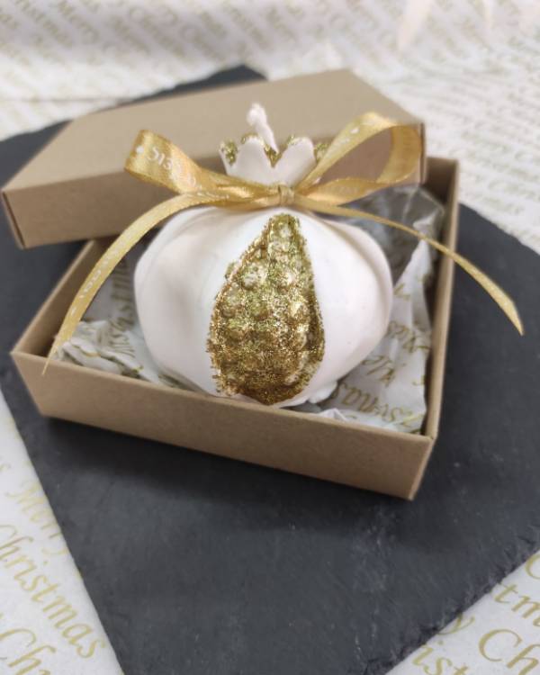 Κερί χριστουγεννίατικο ρόδι λευκό, με λεπτομέρειες χρυσές. Η δίασταση του είναι 8 Χ 8 εκ. Θα το παραλάβετε σε συσκευασία δώρου.