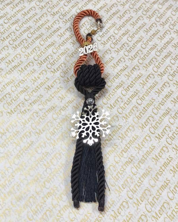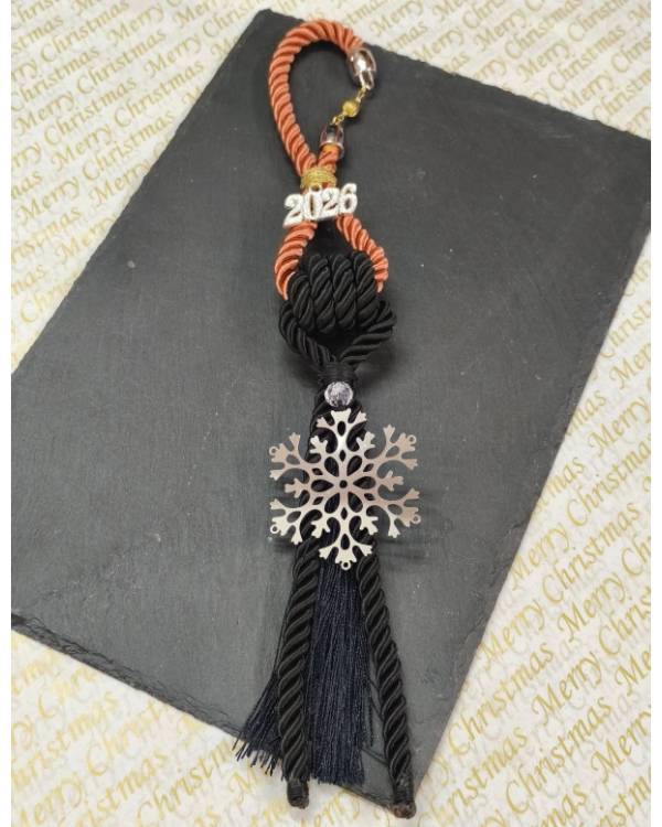 Χειροποίητο γούρι με ατσάλινο στοιχείο χιονονιφάδα, με σχοινία μαύρο και κανελί και στοιχείο 2026.  Η δίασταση του στοιχείου είναι 6 Χ 6 εκ και όλο έχει μάκρος 34 εκ. Θα το παραλάβετε σε συσκευασία δώρου.