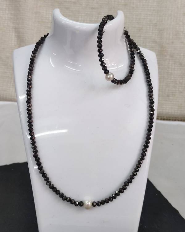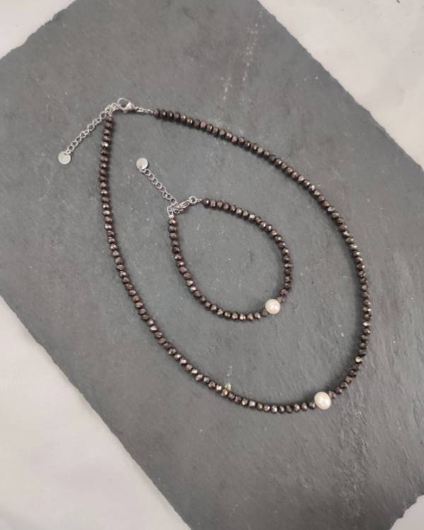 Χειροποίητο σέτ κολίε και βραχίολι με κρύσταλλα καφέ και με μαργαριτάρι του γλυκού νερού. Η δίασταση του κολίε είναι 42 εκ, το βραχίολι είναι 18 εκ. το κούμπωμα διαθέτει αλυσιδάκι αυξομείωσης. Θα το παραλάβετε σε συσκευασία δώρου.
