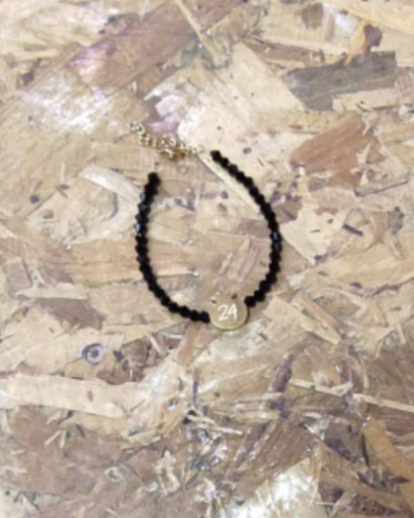 Βραχίολι χειροποήτο με χάντρες μάυρες, περασμένες σε ατσαλόσυρμα , με ατσάλινο χρυσό στοιχείο ρόδι , με το 24 πάνω. Με κούμπωμα αυξομείωσης με αλυσιδάκι. Το μάκρος του είναι 16 εκ και με το κούμπωμα 17 εκ.