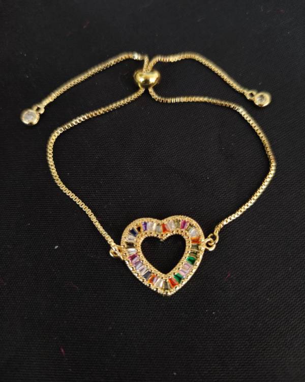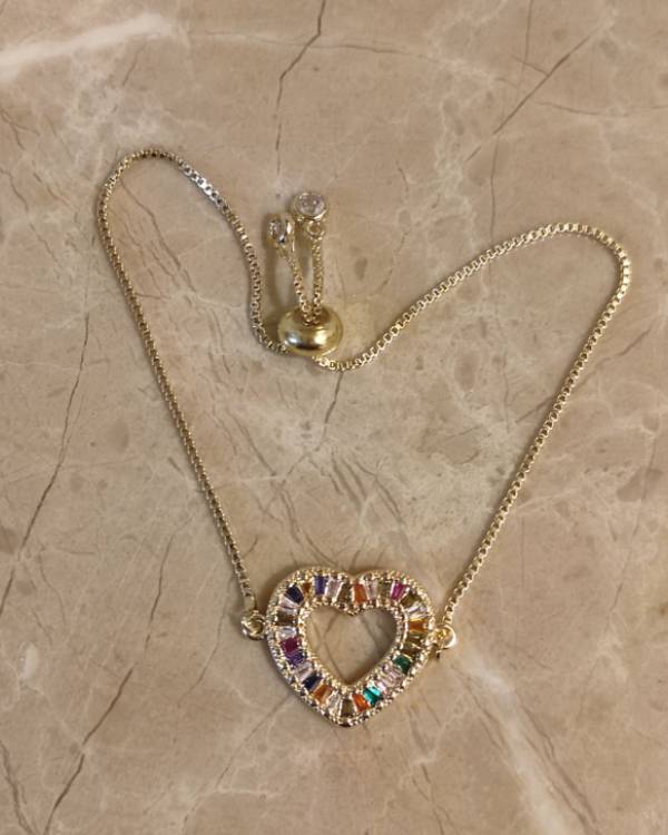 Βραχίολι με αλυσίδα χρυσή και στοιχείο καρδία χρυσή με πολύχρωμες πέτρες. Η καρδία έχει διάσταση 2 Χ 2 εκ. Σάς έρχετε σε συσκευασία δώρου.