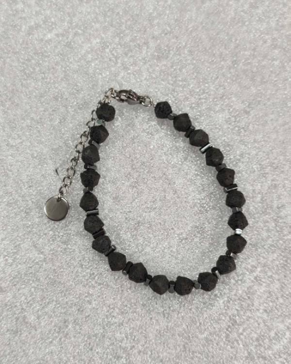 Χειροποιήτο βραχίολι, με πέτρες λάβα και αιματήτες στικάκι, περασμένες σε ατσαλόσυρμα. Η δίασταση του είναι 17.5 εκ. Διαθέτει αλυσιδάκι για αυξομειώση. Θα το παραλάβετε σε συσκευασία δώρου.
