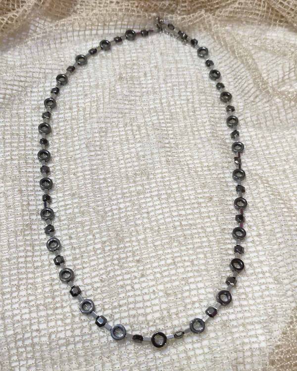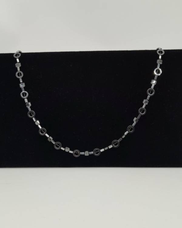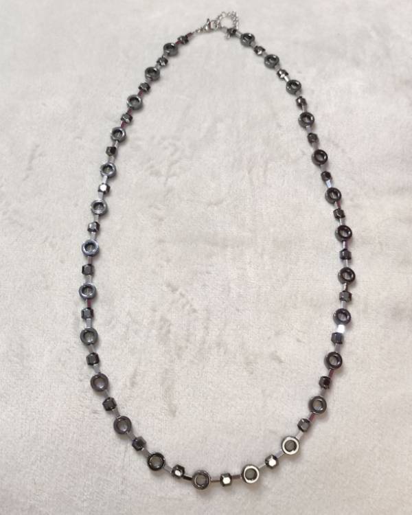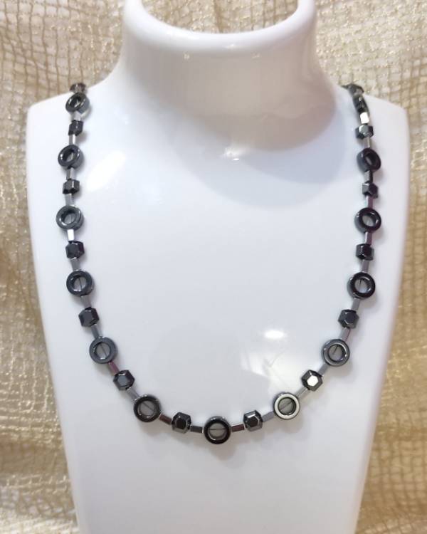 Κολίε χειροποίητο με ημιπολύτιμες πέτρες αιματίτη πλακέ και κρίκους. Περασμένες σε ατσαλόσυρμα με κούμπωμα αυξομείωσης αλυσιδάκι. Η διάσταση του γύρω απο τον λαιμό είναι 62 εκ ή ύψος 30 εκ.